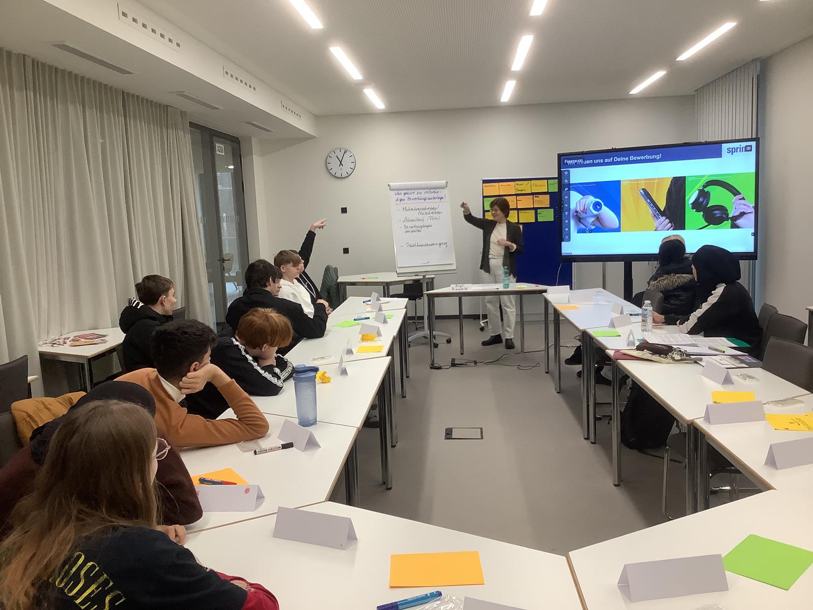 Insgesamt 18 ausbildungsinteressierte Schüler*innen des 10. Jahrgangs nahmen teil. Geleitet wurde der Workshop durch Frau Bielefeld, der Ausbildungsbeauftragten der Firma SPRINT Sanierung.